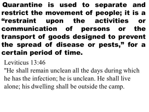 2 - LEVITICUS 13: 4, 5, 46 - If you have symptoms, keep your distance, cover your mouth and avoid contact (Isolation).